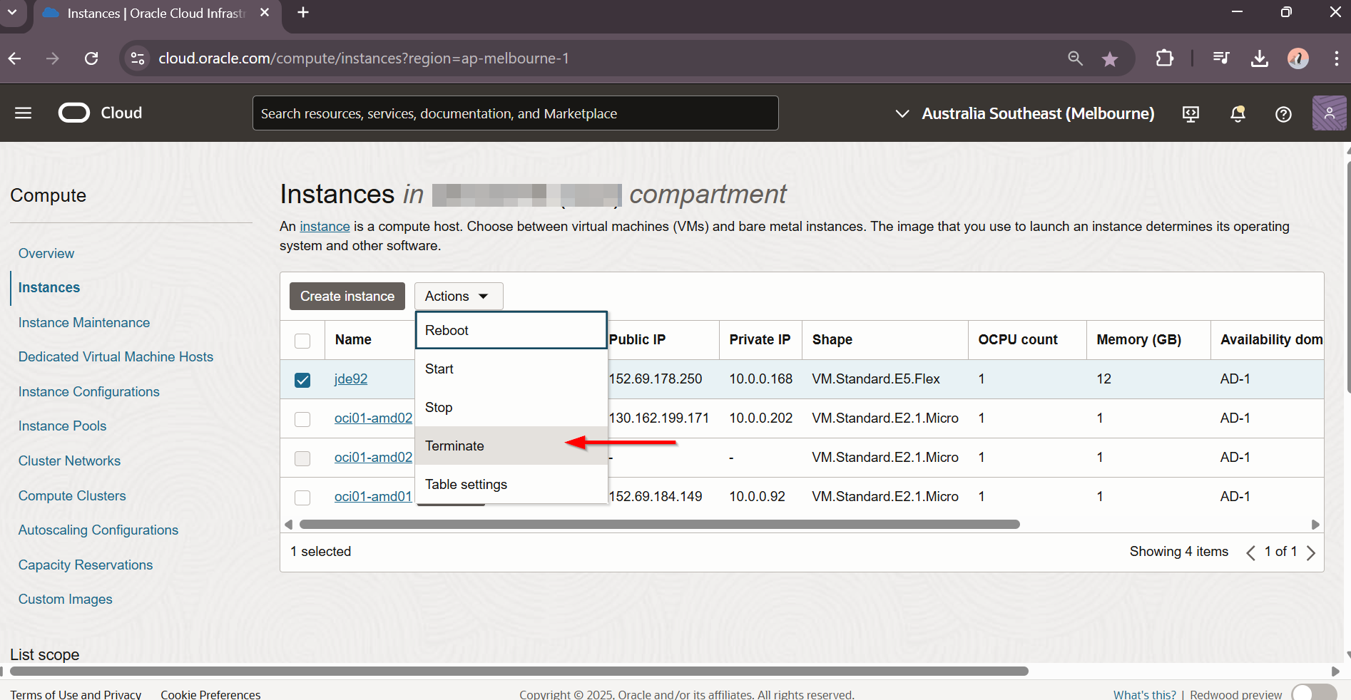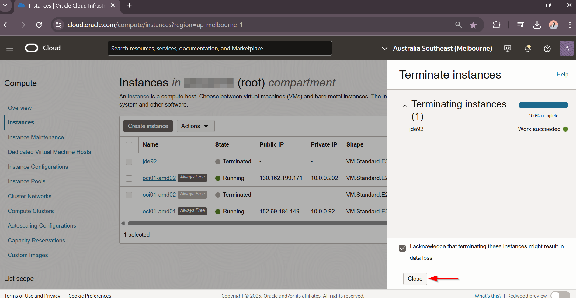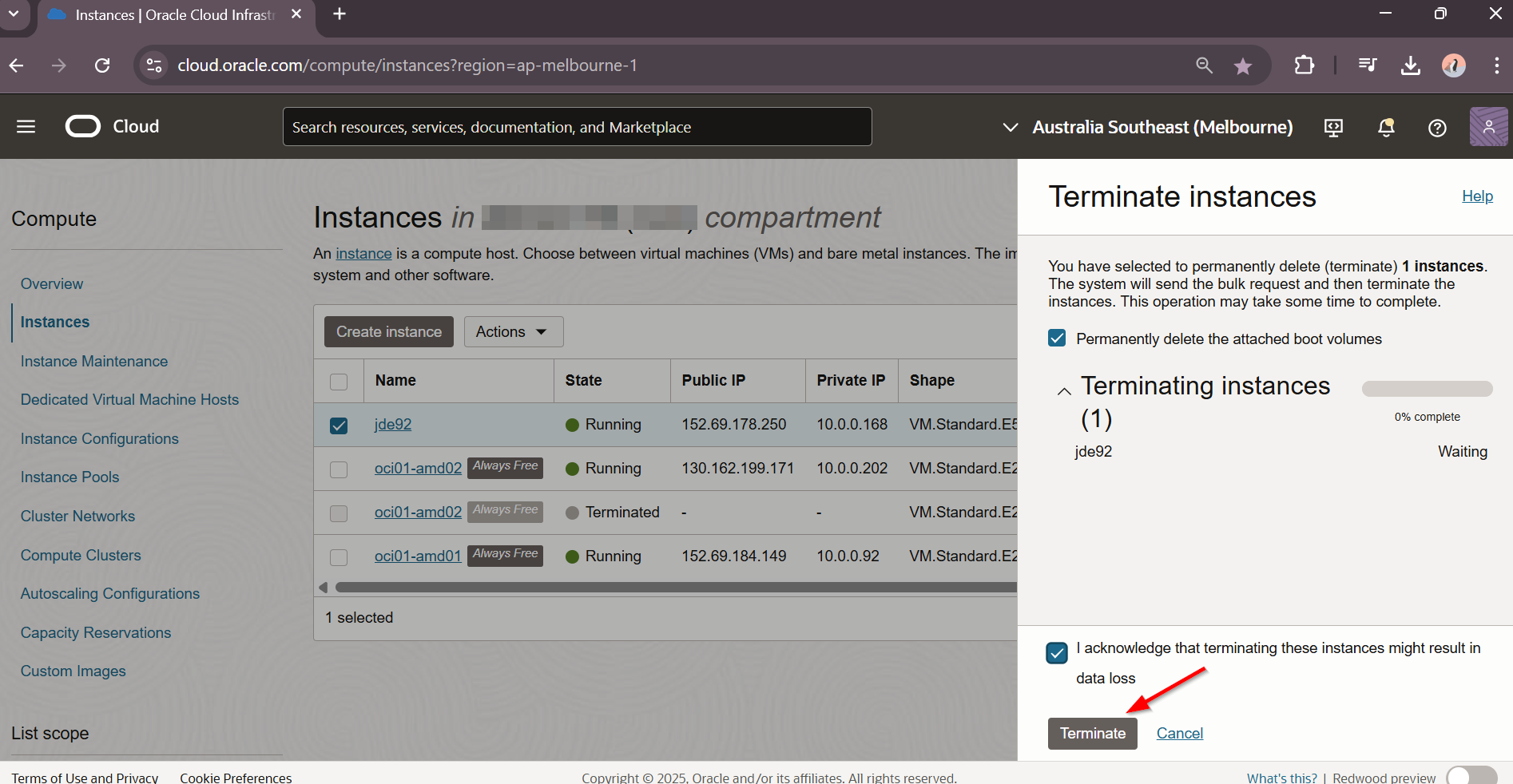 Enable : Permanently delete the attached boot volumes and I acknowledge that terminating these instances might result in data loss. Select Terminate